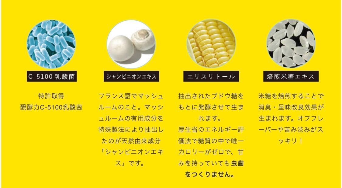 シャンピニオンエキスやC-5100乳酸菌、エリスリトールなどを配合。さらに、タブレット1粒に8000億個の乳酸菌エキス(なんとヨーグルトの80個分相当)が配合されtています。